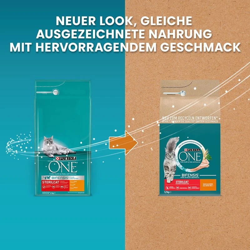 PURINA ONE Sterilcat contains chicken as the first ingredient, which serves as a source of high-quality proteins and also contributes to the delicious taste of the food. The recipe contains all the nutrients and vital substances necessary for your cuddly tiger’s daily diet. Good to know: The complete food from PURINA ONE is available in a recyclable bag with a freshness seal.